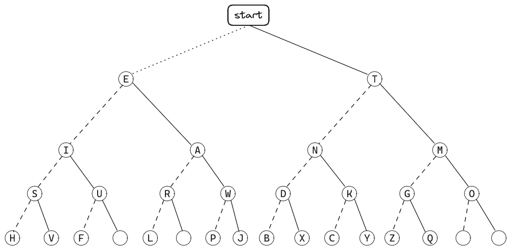 Morse code was designed to be very efficient and uses only two symbols (or sounds) to allow sending with a single key. A short sound is represented by a dot, while a longer sound (twice as long) is represented as a dash. Spaces between words are longer pauses (equivalent to three dots). Combinations of dots and dashes are used to represent letters. It’s a variable-length encoding scheme, so some letters only require a single symbol, others two, others three, etc.
