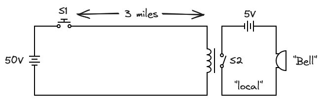 Pushing the button for switch S1 rings the bell by activating the switch S2 of the relay over 3 miles away. The 5V batteries near the bell only need to power the bell on the “local” circuit, while the 50V batteries supply the current from the distance of the button to the bell (the “bell” has an electromagnet and armature not shown). By ringing the bell in patterns someone could send messages over this distance, but how would someone at the bell send messages back?