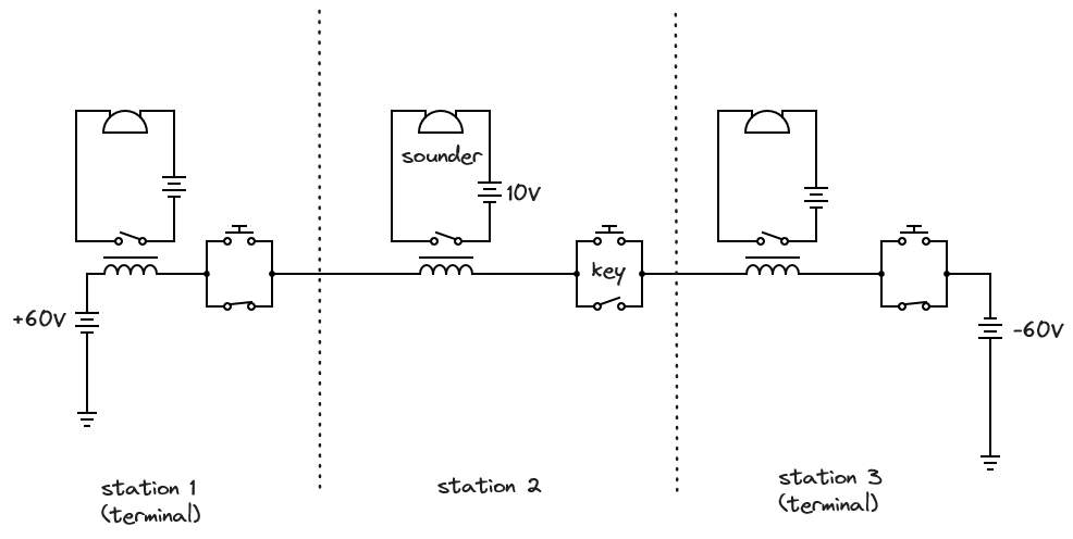 Station 2 is an intermediary station with only a small battery stack for local instruments. There could be an arbitrary number of these intermediary stations on a line, usually one in each town between the terminals. But only one station on the line could send at a time. Every station on the line would receive the message being sent, though the message was typically addressed to a particular station. This is very similar to how Ethernet would be designed more than 100 years later.
