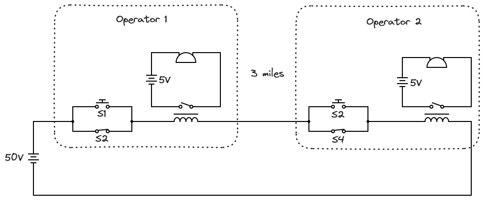 Notice that both S2 and S4 are normally closed, and the line is powered up. When operator 1 wants to send a message, they enable their key by opening S2. Now the line is powered off because the circuit is broken. Operator 2 will notice this because the metal armature that was resting against his bell will now move. Now operator 1 can send his message by pressing S1 in a pattern that rings the bell for operator 2. When he’s done, he closes the S2 switch and the line is active again. Now operator 2 can send a message back by opening his S4 switch and sending a message via his S3 key, ringing Operator 1’s bell.